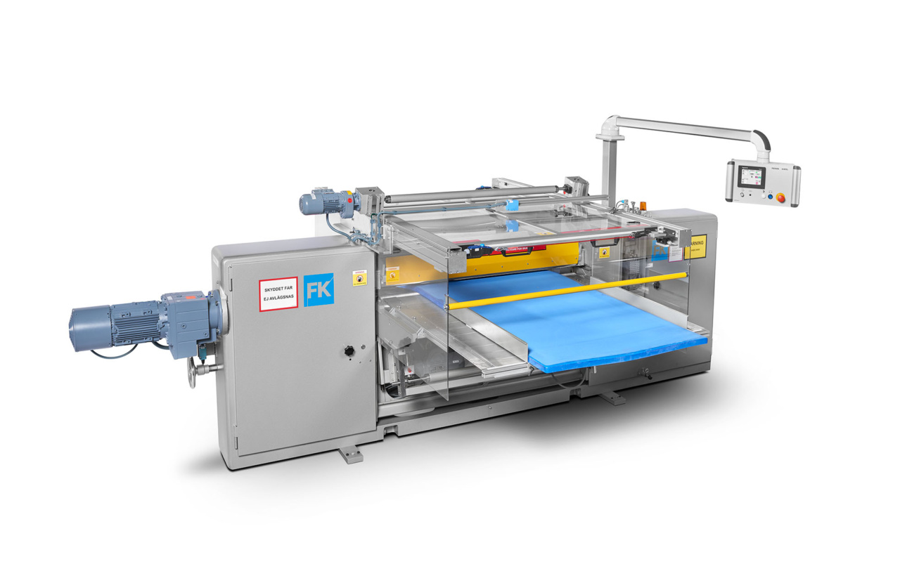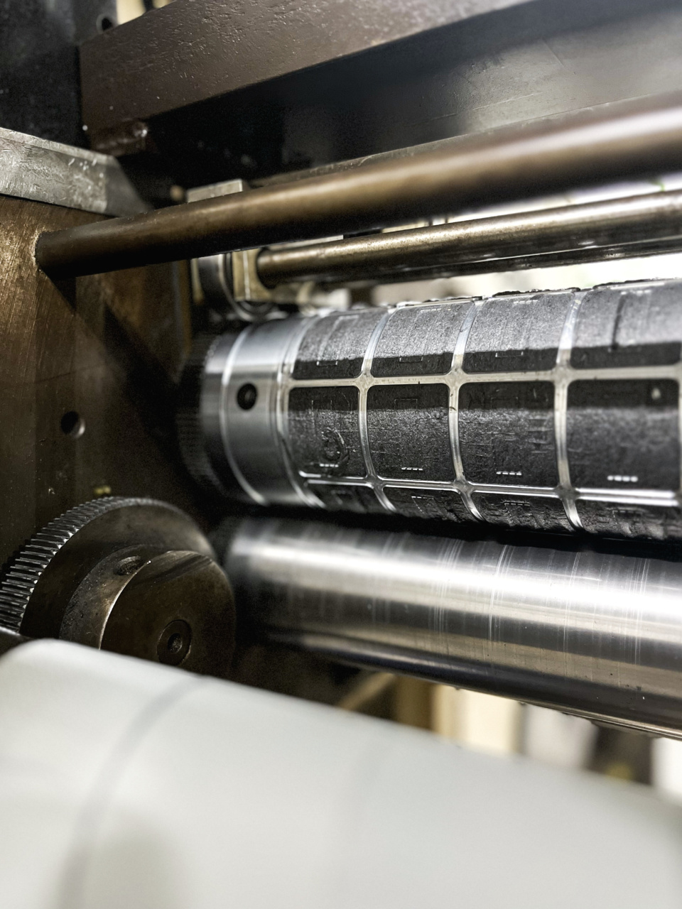 Machinery with multiples stations allows laminating and cutting multiple layers of materials. Cylindrical steel dies rotate over the material to cut precise shapes at high speeds.